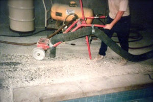 Scabbling utilizes piston driven carbide tipped heads which impact the surface at a rapid rate pulterizing concrete or brittle coatings. Scabbling can be very effective in the removal of slightly bonded coatings or where the coatings are impossible to be removed by the shot blasting process.